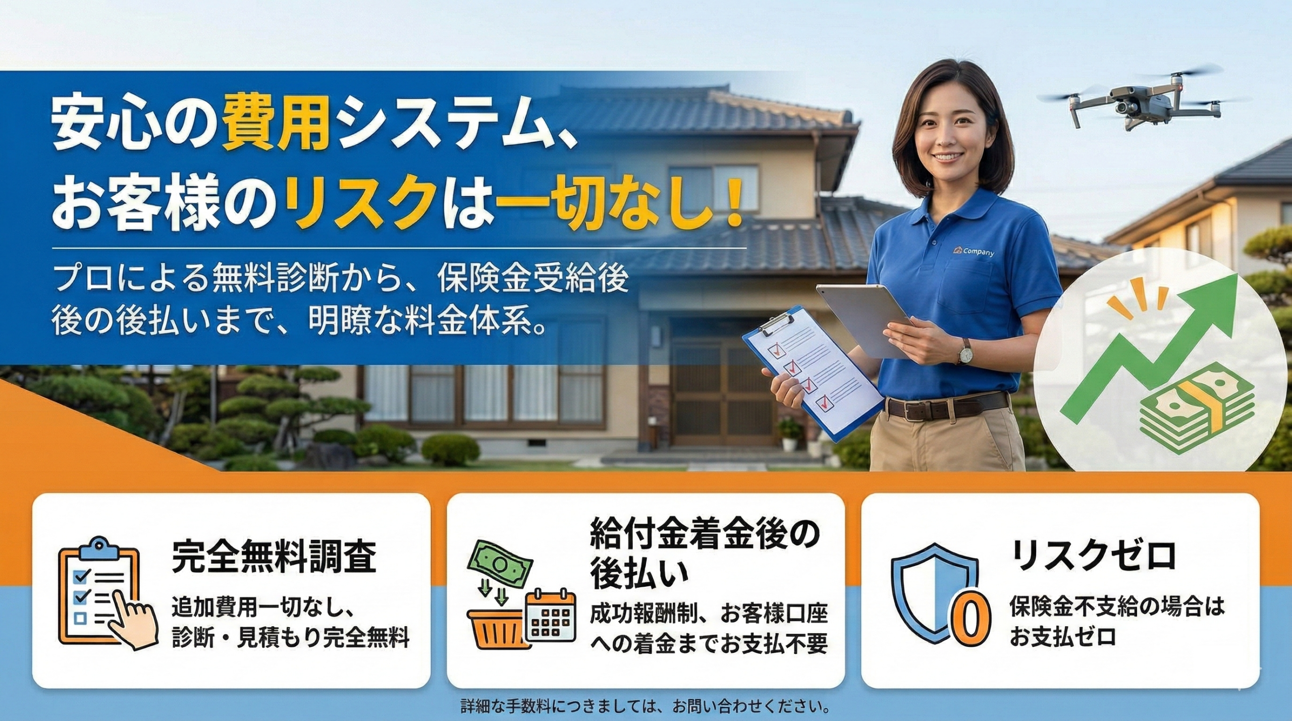 調査の結果、自然災害の被害が見つからなかった場合や、保険会社に申請して否決された場合、お客様のお支払いは完全に「0円」です。お客様が金銭的なリスクを負うことは一切ございません。