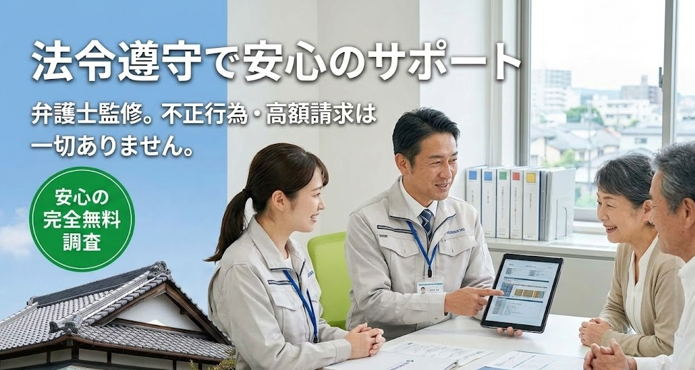 ご安心ください。当社は法令を厳守し、弁護士の指導のもとで適法かつクリーンなサポート業務のみを行っております 。悪徳業者のように「わざと家屋を壊して保険金を請求する」「保険金で必ず直せると嘘をつき、高額な工事契約を無理やり結ばせる」といった詐欺的な行為は一切行っておりません 。