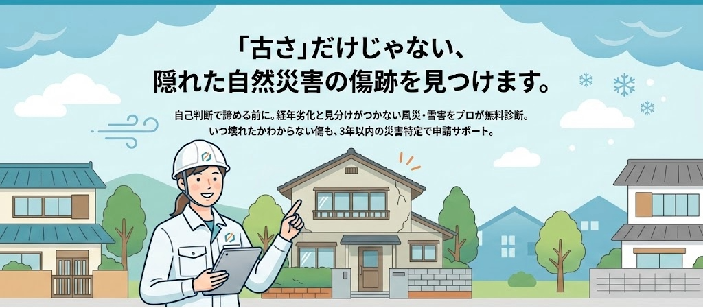 ぜひ拝見させてください。経年劣化そのものは保険適用外ですが、お客様が「古くなったから」と思い込んでいる傷が、実は過去の「台風」や「雪害」による自然災害と判明し、100万円以上の給付金が下りるケースが非常に多くあります。自己判断で諦めず、まずはプロの無料診断をご活用ください。