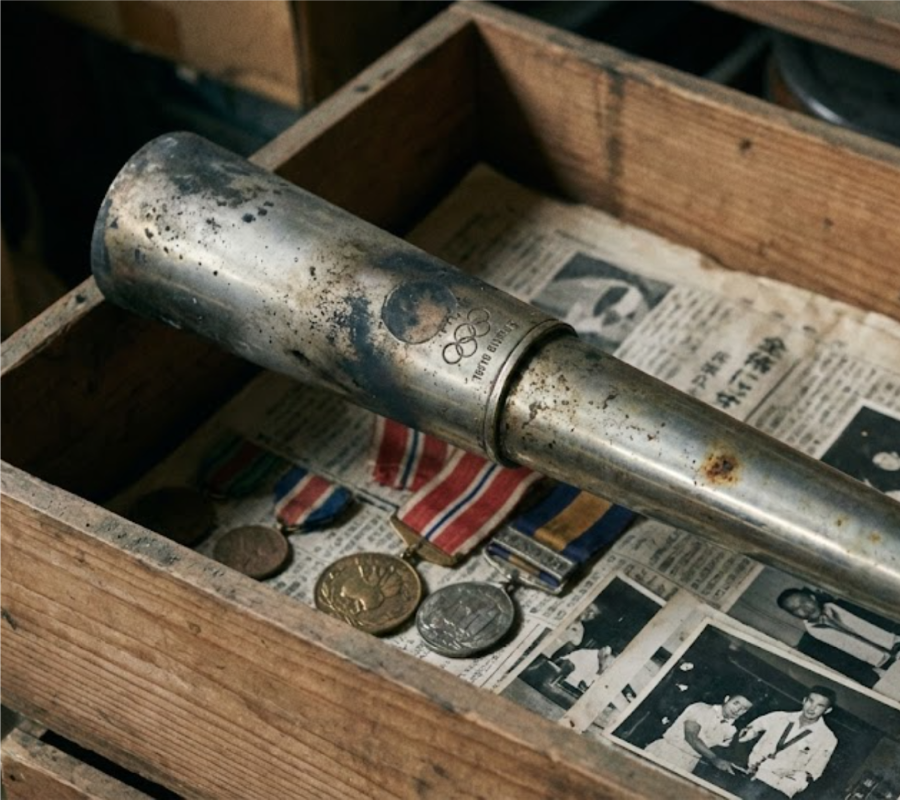 それは、1964年。日本中が熱狂した**「東京オリンピック」の本物の聖火トーチ**だったのです。 持ち主であったお父様が「恐らく祖父がしまっていて誰も知らないからそのまま置いて合ったんだ」どれほど大切に保管されていたか。その煤けた金属肌がすべてを物語っていました。
